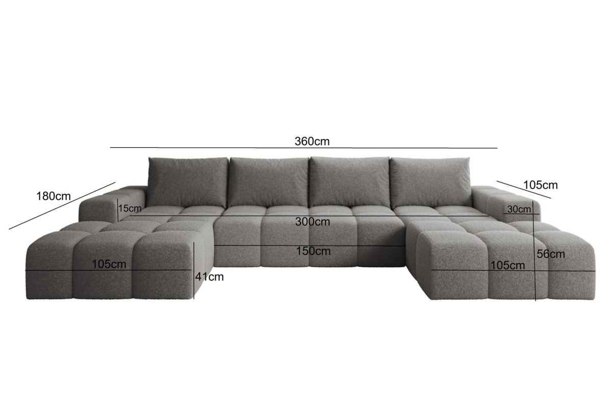 Der Stoff Centaur überzeugt nicht nur durch seine Weichheit und angenehme Struktur, sondern auch durch seine hohe Abriebfestigkeit, die Langlebigkeit und ein hervorragendes Erscheinungsbild über viele Jahre garantiert. Die großzügige Konstruktion in U-Form bietet viel Platz zum Entspannen – sowohl im Alltag als auch bei geselligen Treffen. Weiche Rückenkissen passen sich optimal dem Rücken an, während die оригинellen, gesteppten Sitzflächen dem Möbel einen modernen, geometrischen Charakter verleihen.